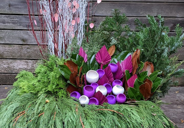 Tell me the size of your planters and the colour scheme you would like. Any other criteria? For instance, this is a 36" round planter with a variety of greens and colourful natural accents arranged symmetrically.